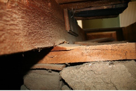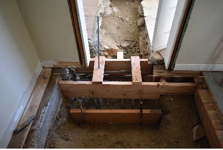 Issues/Concerns: The roof structure has temporary shoring supports due to cracks in wood roof truss members. The log walls are leaning and shifting. There is wood decay, rot, and crushing failures.
